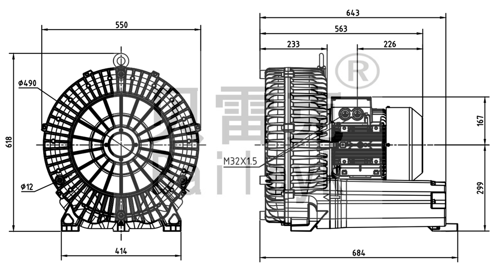 最大風(fēng)量:1370m3/h 最大正壓:110mbar 最大負(fù)壓:120mbar 防護等級:IP55 噪音:75db 重量:98Kg